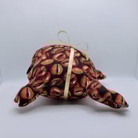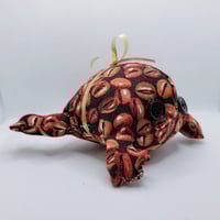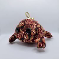 A little frog plush with a coffee bean pattern! They're ready to sit on your desk or travel on your car's dashboard to your local coffee shop!